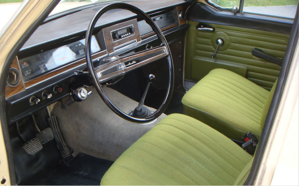 Перед вами автомобиль 1973 года выпуска. На нём ещё стоит комбинация приборов с ленточным спидометром, какие устанавливали до 1975 года. Скорость на этом приборе указывает не стрелка, а лента, которая как бы заполняет полоску по мере набора скорости (похоже на индикацию загрузки в компьютерных играх). Кроме того, от более поздних 24-х машина отличается мягкой вставкой между передними сиденьями, превращающей их в целый диван.