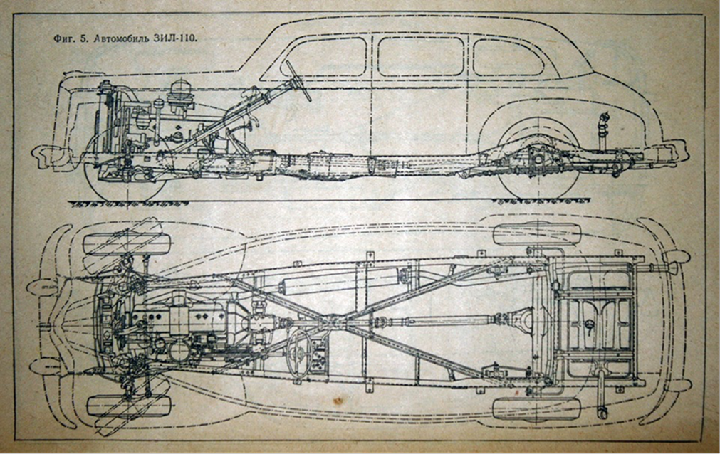 Чертёж шасси автомобиля ЗИС-110. Чертёж сделан после 1956 года, так как фигурирует индекс «ЗИЛ-110». Наименование предприятия сменилось с ЗИС на ЗИЛ по политическим мотивам в 1956 году.