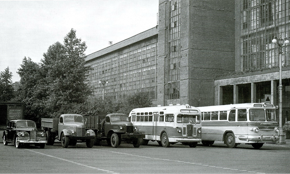Продукция Завода имени Сталина. Слева направо: ЗИС-110, ЗИС-150, ЗИС-151, ЗИС-155, ЗИС-127 (территория ЗИС, 1956 год)