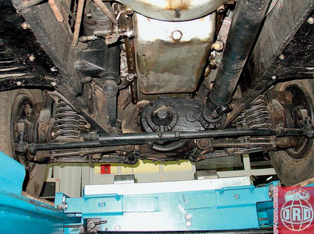 При этом под двигателем не было предусмотрено место под редуктор, аналогичный по параметрам редуктору заднего моста. Поэтому инженеры пошли на хитрость — поставили редуктор небольшого размера и с иным, чем на заднем мосту, передаточным числом, а для уравнивания значения передаточных чисел установили ещё один редуктор между раздаточной коробкой и редуктором переднего моста. Раздаточная коробка позволяла не только подключить передний мост, но и включить понижающий ряд передач.