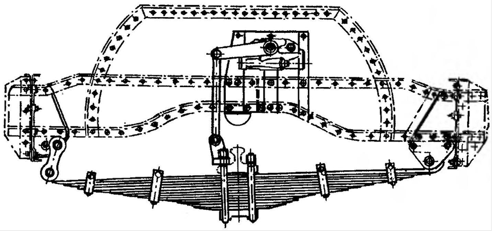 Передняя подвеска (вид сбоку), в верхней части виден рычажный амортизатор, подобные устанавливались и на легковые автомобили (например, на ГАЗ-21 до 1962 года)